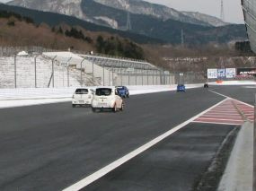 ピットロード脇には雪が残ってます。 |